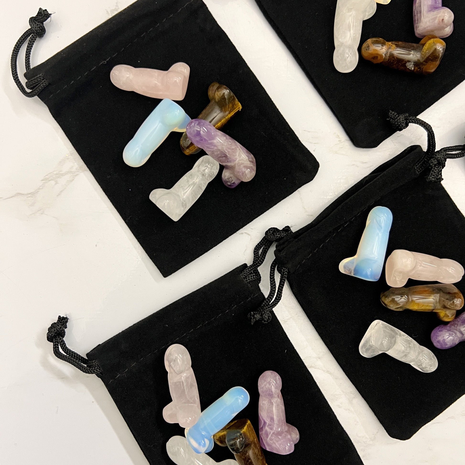 Each velvet bag contains a mix of small crystal phallus carvings, one each of rose quartz, amethyst, tiger’s eye, opalite, or clear quartz. Each crystal is approximately 25mm. Due to the handmade nature of the stones, shapes and sizes vary slightly.